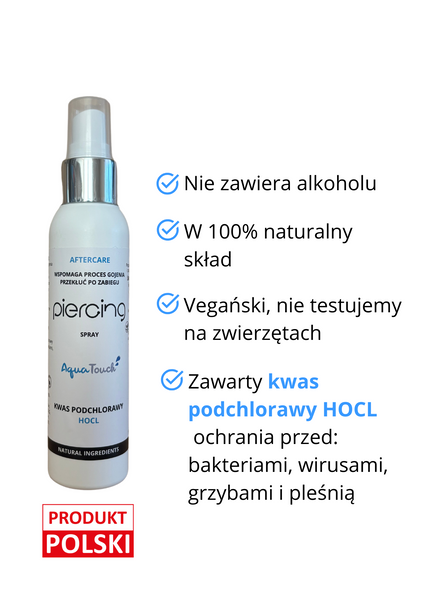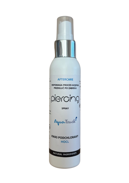 AquaTouch piercing to spray posiadający w 100% naturalny skład, przeznaczony do pielęgnacji zabiegu piercingu. Zawarty kwas podchlorawy HOCL posiada właściwości antybakteryjne, przeciwwirusowe i antyzapalne.